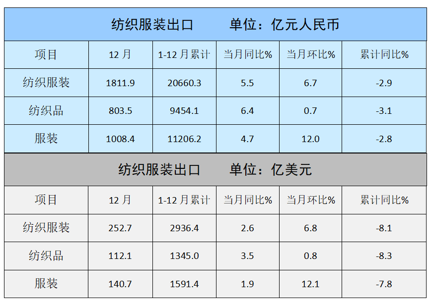 In December 2023, textile and garment exports were 181.19 billion yuan, an increase of 5.5% year on year, an increase of 6.7% month on month, of which textile exports were 80.35 billion yuan, an increase of 6.4%, a growth of 0.7% month on month, and clothing exports were 100.84 billion yuan, an increase of 4.7%, a growth of 12.0% month on month.